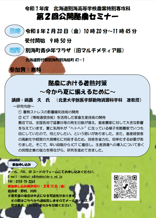 農業特別専攻科主催による第2回公開酪農セミナーを、2月20日(金)に別海町青少年プラザにて開催いたします。本セミナーは、地域の酪農関係者や将来酪農を担う人材を対象に、最新の知見や現場で役立つ情報を共有することを目的として実施するものです。